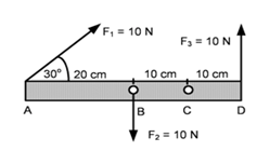Sebuah tongkat yang panjangnya 40 cm mendapat tiga gaya yang sama besarnya 10 newton seperti pada gambar.