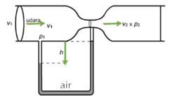 Sebuah venturimeter digunakan untuk mengukur kecepatan cairan X yang memiliki massa jenis 5 kg/m3. Penampang pipa besar memiliki diameter 6 cm dan penampang pipa kecil memiliki diameter 3 cm.