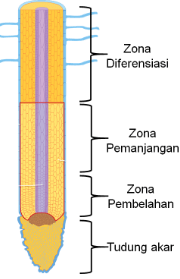 zona pembelahan - tudung akar - zona diferensiasi - zona pemanjangan