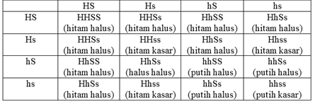 Seekor kelinci bulu hitam halus dikawinkan dengan kelinci bulu putih kasar. Bulu hitam (H) dominan terhadap bulu putih (h) sedangkan bulu halus (S) dominan terhadap bulu kasar (s). Jika F1 dikawinkan sesamanya, maka perbandingan fenotipe F2 adalah....