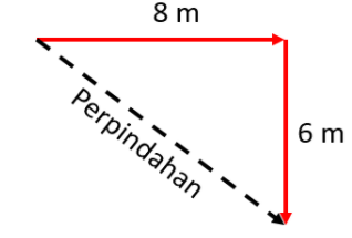 Seekor kuda bergerak ke timur sejauh 8 meter kemudian ke selatan sejauh 6 meter. Jarak dan perpindahan yang dialami oleh kuda adalah ....