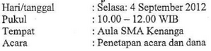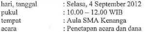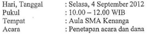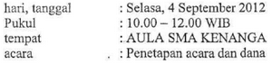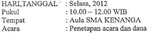 Sehubungan dengan persiapan pelepasan kelas XII SMA Kenanga, kami panitia mengundang Bapak/Ibu pengurus komite SMA Kenanga untuk menghadiri rapat yang diadakan pada,