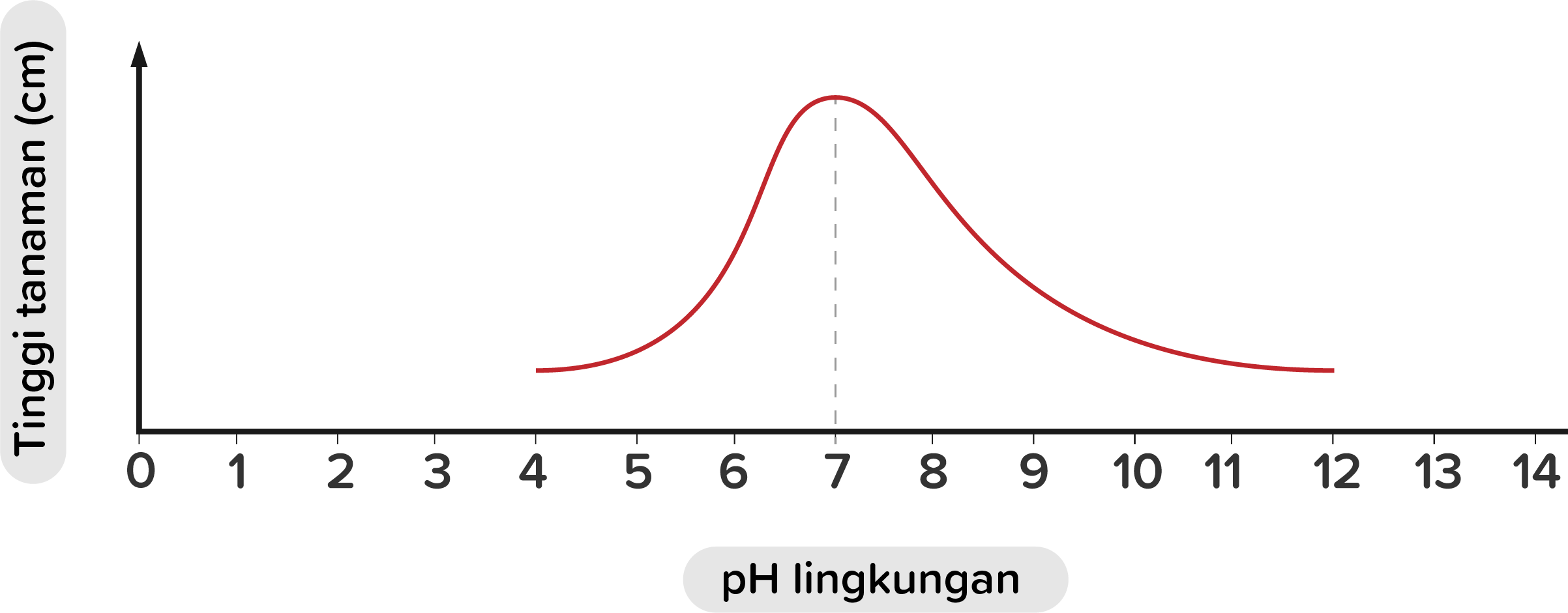 Sekelompok siswa melakukan percobaan pengaruh pH terhadap pertumbuhan tumbuhan. Tumbuhan diberi perlakukan dengan menempatkan pada lingkungan dengan pH yang berbeda-beda. Hasil percobaan digambarkan dengan grafik dibawah ini.
