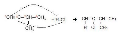 jenis reaksi: adisi, hasil reaksi: 3-metil-2-kloro-1-butena