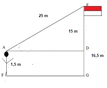 Seorang anak berdiri sejajar dengan tiang bendera dengan tinggi tiang 16,5 m. Anak dengan tinggi 1,5 m tersebut memandang ujung tiang bendera dengan jarak pandang 25 m. Sudut pandang adalah . Tentukan jarak anak dengan tiang bendera!