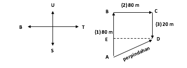 Seorang anak berlari menempuh jarak 80 m ke utara, kemudian membelok ke timur 80 m dan ke selatan 20 meter. Besar perpindahan yang dilakukan anak tersebut adalah ….