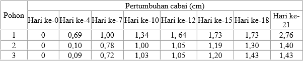 Seorang anak ingin melakukan sebuah percobaan untuk menentukan pengaruh pupuk terhadap pertumbuhan tanaman cabai. Terdapat tiga buah pohon cabai, pohon pertama diberikan pupuk kompos sapi, pohon kedua diberikan pupuk kompos ayam, dan pohon ketiga diberikan pupuk kompos kambing. Hasil percobaannya ditunjukkan pada tabel berikut.