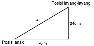Seorang anak menaikkan layang-layang dengan benang. Jarak anak di tanah dengan titik yang tepat berada di bawah layang-layang adalah 70 meter dan ketinggian layang- layang adalah 240 meter. Hitunglah biaya panjang benang yang diperlukan jika harga benang Rp200,00 per meter!