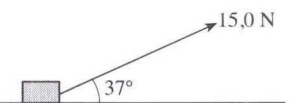 Seorang anak mengerjakan gaya 15,0 N dengan sudut pada sebuah kereta luncur (massa 4,00 kg), seperti ditunjukkan dalam gambar. Gaya gesekan yang bekerja pada kereta adalah 2,50 N. Anggap kereta mulai meluncur dengan kelajuan awal 1,00 m/s. Gunakan rumus teorema usaha-energi untuk menghitung kelajuan akhir kereta setelah anak meluncur sejauh 4,00 m!