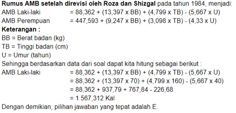 Seorang laki-laki berumur 40 tahun, memiliki berat badan 70 kg dan tinggi badan 160 cm. Berdasarkan rumus Roza dan Shizgal maka laki-laki tersebut akan memiliki nilai AMB sebesar….