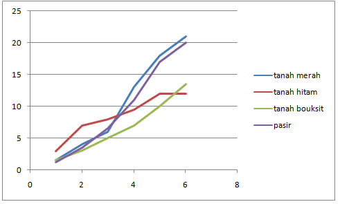 Seorang mahasiswi sedang melakukan penelitian yang berjudul pengaruh media tanah terhadap pertumbuhan dan perkembangan tanaman hijau. Hasil penelitian dapat dilihat pada grafik berikut.