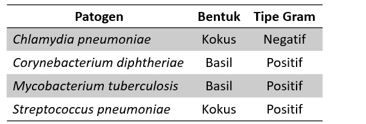Seorang pasien yang sedang mengalami permasalahan pada saluran pernapasan melakukan uji sampel lendir yang diambil dari rongga hidung. Berdasarkan hasil pengujian laboratorium yang dilakukan, ditemukan bakteri dengan bentuk bulat dan menyerap warna merah saat dilakukan pewarnaan gram. Data pasien tersebut dapat kita lihat pada tabel berikut.