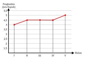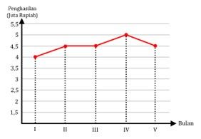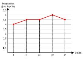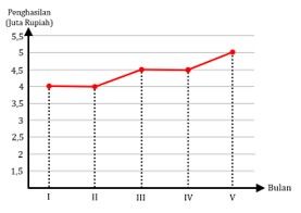 Seorang pedagang mencatat penghasilannya selama beberapa bulan berturut-turut yakni Rp4.000.000,00; Rp4.500.000,00; Rp4.500.000,00; Rp5.000.000,00; dan Rp4.500.000,00. Jika data tersebut disajikan dalam diagram garis, maka diagram yang tepat adalah ....