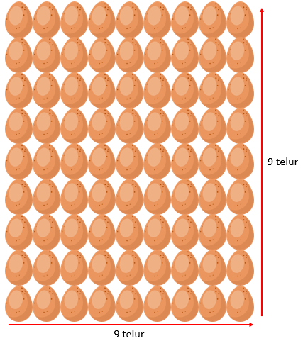 Seorang pedagang menjual telur dalam bentuk paket yang mengikuti pola persegi. Paket 1 terdiri dari 1 telur, paket 2 terdiri dari 4 telur, paket 3 terdiri dari 9 telur, dan seterusnya. Paket 9 terdiri dari ... telur.