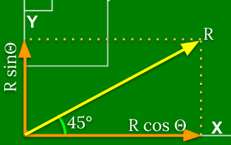 Seorang pemain bola menendang bola dari sudut lapangan. Bola tersebut mengalami perpindahan sejauh 15 m dengan membentuk sudut 45º dari lebar lapangan (anggap sebagai sumbu X). Notasi vektor perpindahan bola tersebut dalam vektor satuan adalah ...
