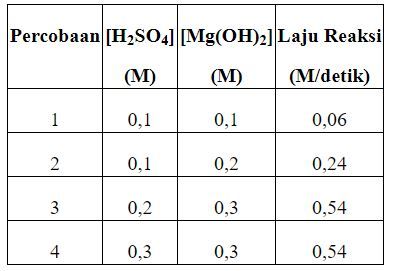 Seorang peneliti mengamati reaksi antara asam sulfat dan magnesium hidroksida pada suhu tetap, dengan persamaan reaksi berikut.