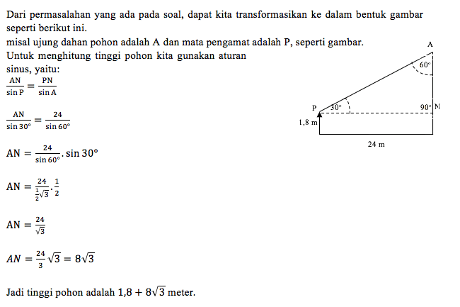Seorang peneliti sedang mengamati pertumbuhan pohon jati, jarak orang tersebut terhadap pohon adalah 18 meter. Jika orang tersebut mempunya tinggi 1,8 meter dan arah pandang dengan sudut elevasi 30o terhadap pohon, maka tinggi pohon tersebut adalah ....