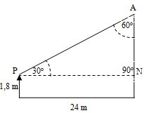 Seorang peneliti sedang mengamati pertumbuhan pohon jati, jarak orang tersebut terhadap pohon adalah 24 meter. Jika orang tersebut mempunyai tinggi 1,8 meter dan arah pandang dengan sudut elevasi 30o terhadap pohon, maka tinggi pohon tersebut adalah ... m.