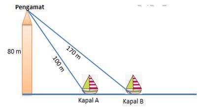 Seorang pengamat berada di atas sebuah mercusuar yang memiliki ketinggian 80 meter. Pengamat melihat kapal A dan kapal B. Jarak pengamat ke kapal A 100 meter dan jarak pengamat ke kapal B 170 meter. Posisi alas mercusuar, kapal A, dan kapal B segaris. Jarak antara kapal A dan kapal B adalah ...