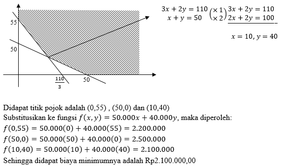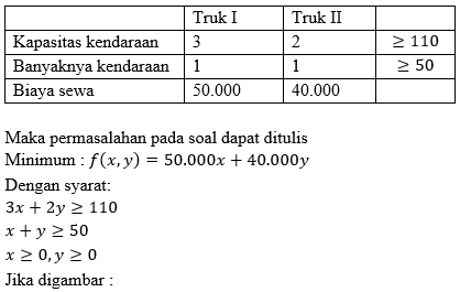 Seorang pengusaha material hendak mengangkut 110 ton barang dari gudang A ke gudang B. Untuk keperluan ini sekurang – kurangnya diperlukan 50 kendaraan truk yang terdiri dari truk jenis I dengan kapasitas 3 ton dan truk jenis II dengan kapasitas 2 ton. Biaya sewa truk jenis I dan truk jenis II masing – masing Rp50.000,00 dan Rp40.000,00. Banyak jenis truk yang harus disewa agar biaya yang dikelurakan sekecil – kecilnya adalah…
