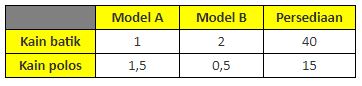 Seorang penjahit akan membuat 2 model pakaian. Dia mempunyai persediaan kain batik 40 meter dan kain polod 15 meter. model A memerlukan 1 meter kain batik dan 1,5 meter kain polos, sedang model B emmerlukan 2 meter kain batik dan 0,5 meter kain polos. Maksimum banyak pakaian yang mungkin dapat dibuat adalah ...
