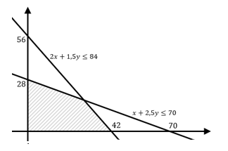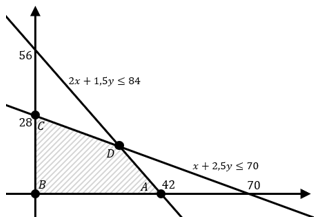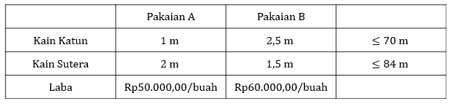 Seorang penjahit membuat dua jenis pakaian. Pakaian jenis A memerlukan kain katun 1 m dan kain sutera 2 m, sedangkan pakaian jenis B memerlukan kain katun 2,5 m dan kain sutera 1,5 m. Bahan katun yang tersedia 70 m dan kain sutera 84 m. Pakaian jenis A dijual dengan laba Rp50.000,00/buah, sedangkan pakaian jenis B dijual dengan laba Rp60.000,00/buah. Agar penjahit memperoleh laba maksimum, banyak pakaian jenis A dan jenis B yang terjual berturut-turut adalah ...