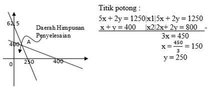 Seorang penjual buah – buahan yang menggunakan gerobak menjual apel dan pisang. Harga pembelian apel adalah Rp1.000,00 tiap kg dan pisang adalah Rp400,00 tiap kg. Modalnya hanya Rp250.000,00 dan muatan gerobaknya tidak melebihi 400kg. Jika keuntungan tiap kg apel 2 kali keuntungan tiap kg pisang, maka untuk memperoleh keuntungan sebesar mungkin pada setiap pembelian, pedagang itu harus membeli…