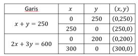 Seorang penjual buah menginginkan dalam sehari dapat menjual minimal 250 buah. Buah yang dijualnya adalah mangga dan melon. Keuntungan dari satu buah mangga adalah 25% dan dari satu buah melon adalah 30%. Dia menginginkan minimal mendapatkan untung sebesar Rp600.000. Jika untuk mendapatkan stok buah, dia membeli buah mangga dengan harga Rp8.000 per buah dan buah melon dengan harga Rp10.000 per buah maka modal terkecil yang harus dia siapkan adalah ....