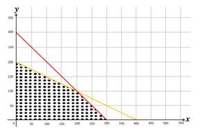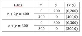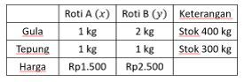 Seorang penjual roti membuat dua jenis roti A dan B untuk dijual. Untuk membuat roti A, diperlukan gula sebanyak 1 kg dan tepung 1 kg. Untuk membuat roti B, diperlukan gula sebanyak 2 kg dan tepung 1 kg. Dia mempunyai stok gula sebanyak 400 kg dan tepung sebanyak 300 kg. Jika satu roti A dijual dan mendapatkan untung sebanyak Rp1.500 dan Rp2.500 untuk satu roti B yang dijual, maka penjual roti tersebut akan mendapatkan keuntungan maksimum sebesar ....