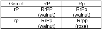 Seorang peternak ayam menyilangkan ayam berpial walnut homozigot dengan ayam berpial rose homozigot. Apabila hasil keturunan -nya disilangkan dengan sesama ayam berpial pea heterozigot, bagaimana persentase fenotipe keturunan yang dihasilkan?