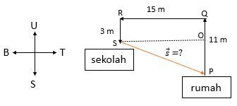 Seorang siswa berjalan dari rumah menuju sekolah. Siswa tersebut berjalan ke arah utara sejauh 11 m, berbelok ke arah barat sejauh 15 m, kemudian ke arah selatan 3 m. Perpindahan siswa tersebut adalah ....