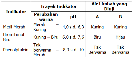 Seorang siswa melakukan pengujian pH air limbah dengan berbagai indikator, data yang diperoleh adalah sebagai berikut :