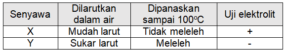 Berdasarkan hasil pengamatan siswa tersebut, ikatan kimia yang terdapat dalam senyawa X dan Y berturut-turut adalah ....
