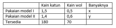 Seorang tukang jahit ingin membuat dua model pakaian yang menggunakan 2 jenis kain. Pakaian model pertama memerlukan 1,5 m kain katun dan 0,5 m kain wol. Sementara pakaian model kedua memerlukan 1,4 m kain katun dan 0,6 m kain wol. Kain katun yang tersedia ada 180 m dan kain wol ada 70 m. Misal banyak pakaian model pertama yang akan dibuat = x dan pakaian model kedua akan dibuat = y, model matematika yang sesuai dengan masalah tersebut adalah....