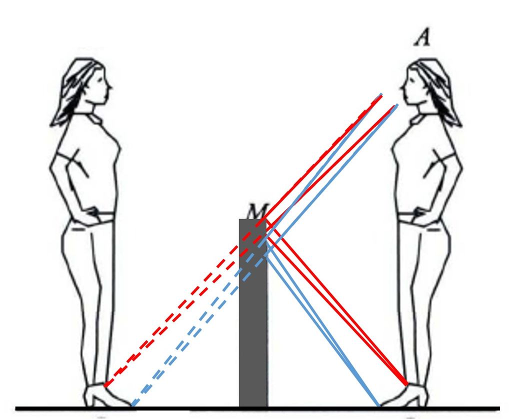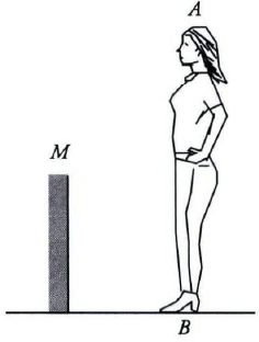 Seorang wanita yang tingginya dihitung dari posisi mata (A) ke kaki (B) adalah 1,6 m seperti tampak pada gambar di samping. Wanita itu tepat dapat melihat bayangan kakinya dalam cermin datar M yang dipasang vertikal. Lukis sinar-sinar dari B ke M untuk menunjukkan bagaimana wanita itu tepat melihat bayangan kakinya!