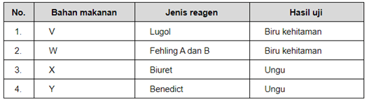 Seorangsiswa melakukan uji makanan, dari hasil percobaannya diperoleh hasil sebagai berikut: