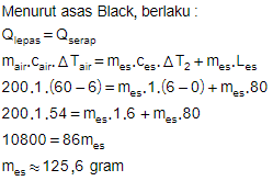 Sepotong es bersuhu 0 oC dimasukkan ke dalam secangkir air bermassa 200 gram bersuhu 60 oC. Jika cangkir dianggap tidak menyerap kalor dan semua es mencair serta campuran mencapai kesetimbangan termal pada suhu 6 oC, maka besar massa es tersebut adalah .... (cair = 1 kal/groC, ces = 0,5 kal/groC, dan Les = 80 kal/gr)