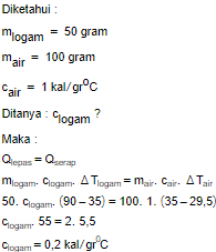 Sepotong logam bermassa 50 gram bersuhu 90 oC dicelupkan ke dalam 100 gram air bersuhu 29,5 oC (kalor jenis air 1 kal/gr0C). Jika suhu akhir 35 oC, maka kalor jenis logam adalah ....