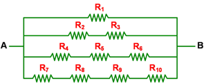Sepuluh buah hambatan listrik identik masing-masing sebesar 20 Ω disusun seperti pada gambar berikut!