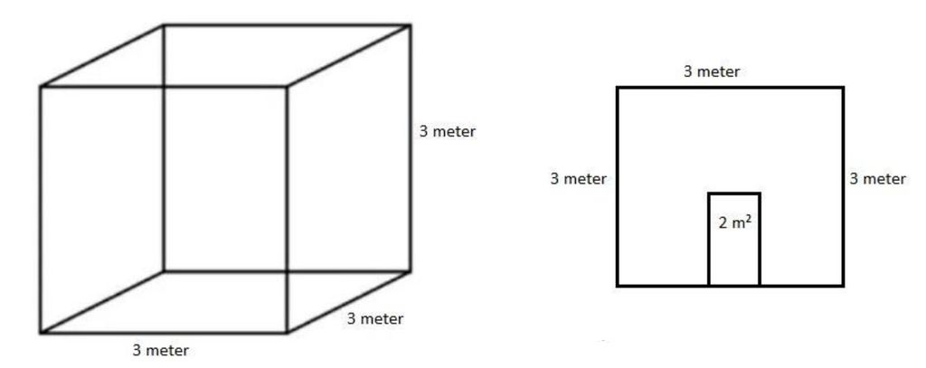 Sepuluh kamar kos berbentuk kubus dengan ukuran panjang rusuk sisi dalam 3 meter. Bagian tembok dan atap kamar kos akan dicat. Adapun luas untuk pintu dan jendela 2 (tidak dicat). Jika satu kaleng cat dapat mengecat seluas 40 , berapa banyak kaleng cat yang diperlukan?