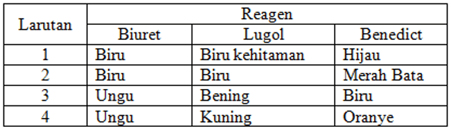 Seseorang melakukan uji terhadap berbagai bahan makanan di laboratorium. Hasil percobaan tersebut ditunjukkan pada tabel berikut ini.