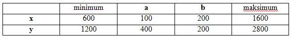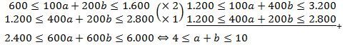 Seseorang membeli dua macam tablet : tablet A dan tablet B sebagai suplemen harian yang masing – masing mengandung elemen X dan Y. Banyaknya elemen X pada tablet A dan B masing – masing adalah 100 mg dan 200 mg, sedangkan banyaknya elemen Y yang terkandung pada tablet A dan B masing – masing 400 mg dan 200 mg. orang tersebut ingin suplemen harian yang dikonsumsi dari kedua tablet ini mengandung tidak kurang dari 0,6 g tetapi tidak lebih dari 1,6 g elemen X dan mengandung tidak kurang dari 1,2 g tetapi tidak lebih dari 2,8 g elemen Y. Jika banyak tablet setiap hari adalah a tablet A dan b tablet B, dimana a dan b adalah nilai yang membuat total tablet yang dikonsumsi sedikit mungkin, maka a + b =…