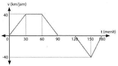 Seseorang mengadakan perjalanan menggunakan mobil dari kota A ke kota B, diperlihatkan oleh grafik di bawah ini, sumbu-Y sebagai komponen kecepatan dan sumbu-X sebagai komponen waktu, maka jarak yang ditempuh kendaraan tersebut selama selang waktu dari menit ke-30 sampai menit ke-120 adalah ...