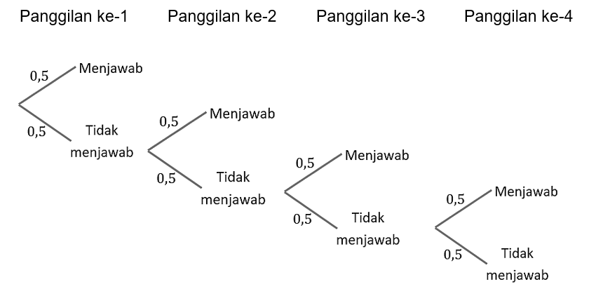 Setiap hari Reza berencana menelepon ibunya. Setiap kali menelepon, peluang ibu menjawab panggilannya adalah 0,5. Jika ibu menjawab teleponnya, maka Reza tidak menelepon lagi pada hari tersebut. Jika ibunya tidak menjawab telepon, maka Reza akan terus mencoba menelepon beberapa saat kemudian. Jika ibunya tidak menjawab sampai 4 kali, maka Reza tidak menelepon lagi pada hari tersebut. Misalkan X menyatakan banyaknya telepon yang tidak dijawab oleh ibu. Rata-rata dan variansi dari banyaknya telepon dari Reza yang tidak dijawab ibunya pada hari tersebut adalah ....