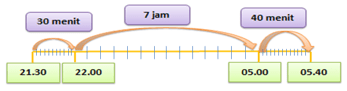 Setiap malam Risma mulai tidur pada pukul 21.30 dan kemudian bangun tidur di pagi hari pada pukul 05.40. Lama waktu tidur Risma adalah…