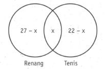 Setiap siswa dalam suatu kelas suka berenang atau main tenis. Jika di dalam kelas ada 30 siswa, sedangkan yang ·suka berenang 27 siswa dan yang suka main tenis 22 siswa, maka yang suka berenang dan main tenis adalah .......... .