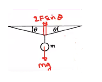 Seuntas tali elastis memiliki panjang 48 cm. Kedua ujung tali diikat di dua titik yang berjarak 48 cm pada ketinggian yang sama. Di tengah-tengah tali digantungkan sebuah beban bermassa m sehingga beban turun dengan seperti yang terlihat pada gambar. Jika percepatan gravitasi setempat dan tali dianggap sebagai sebuah pegas dengan konstanta 1250 N/m, nilai m adalah.....