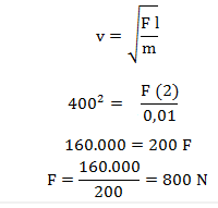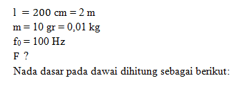 Seutas dawai yang panjangnya 200 cm dan massanya 10 gr ditegangkan dengan gaya F saat dipetik akan menghasilkan nada dasar 100 Hz. Maka besar gaya F tersebut adalah .…