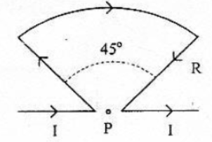 Seutas kawat lurus dilengkungkan dan dialiri arus 6 A seperti pada gambar. Jika jari-jari kelengkungan R = cm, maka besar induksi magnetik di titik P adalah ....