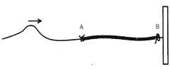 Seutas tali yang tipis disambung dengan tali yang lebih tebal., kemudian diikatkan pada tembok yang kokoh, seperti pada gambar. Jika pada salah satu ujung tali yang tipis diberi gangguan, maka terjadi perambatan gelombang ke arah kanan. Pada saat di A....